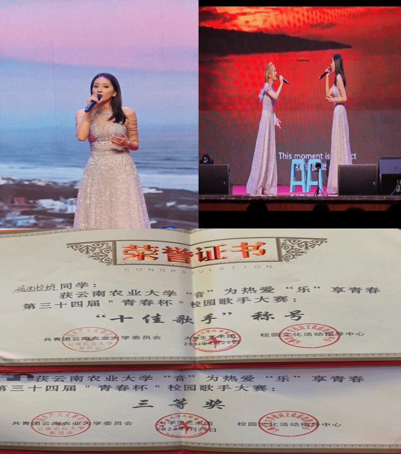 在比赛中,三位选手以饱满的情感和卓越的唱功,赢得评委和观众的一致好评。2021级农学2班的李南同学演唱了《红尘客栈》《空白格》《指纹》,字字句句间流露着对人生的感悟,最终荣获大赛风采奖。来自2021级中草药栽培与鉴定专业的益西拉姆同学,以《innocence》《世界上的另一个我》两首曲目征服全场,获得三等奖和"十佳歌手"称号。2023级农艺与种业硕士研究生皮齐飞同学则以《越人歌》《梨花颂》《霸王别姬》《把一切献给党》四首曲目惊艳四座,他的演唱展现了中华民族传统文化的深厚底蕴和隽永魅力,抒发了革命年代共产党员浴血奋战、矢志不渝的坚定信念和决心,令人动容。最终荣获大赛唯一一等奖和"十佳歌手"桂冠。