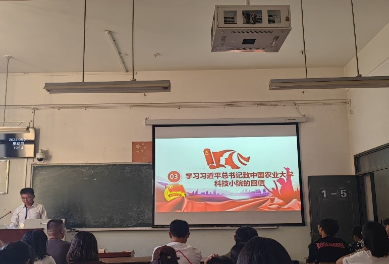 会议还重点学习了习近平总书记致中国农业大学科技小院的回信。习近平总书记的这封回信不仅仅是给中国农大科技小院的同学们的,也是给我们新时代学农、爱农、尚农、强农人的巨大鼓舞和鞭策,号召同学们以学习习近平总书记重要回信精神为契机,厚植爱农情怀,练就兴农本领,在乡村振兴的大舞台上建功立业,为加快推进农业农村现代化、全面建设社会主义现代化国家贡献自己的力量。最后,进行了学习心得总结分享,大会上同学们积极发表自己的学习感想。