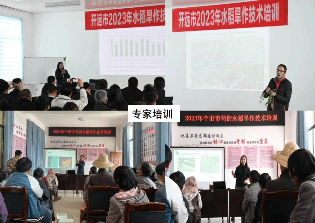 农公司稻作研究所团队从品种选择、整地、播种、中耕管理等方面进行栽培技术讲授,植保公司老师们结合水稻旱作过程中草、虫、病发生规律,进行除草、防虫、控病三个方面授课,并发放“水稻旱作种植技术手册”138份。