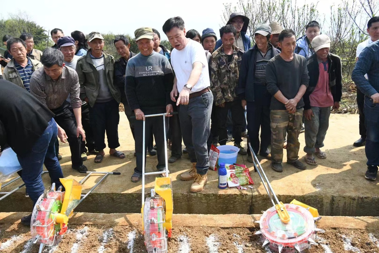 最后,朱有勇院士到田间地头,在典型喀斯特地貌的苟街村,朱院士将课堂搬进田地,手把手教农户进行水稻旱种播种。朱有勇院士指出,该项种植技术很简单,不用大型机器,只用点力,老人推着就可以把种子种下去,方法和操作很简单,一人每天可以种4~5亩。